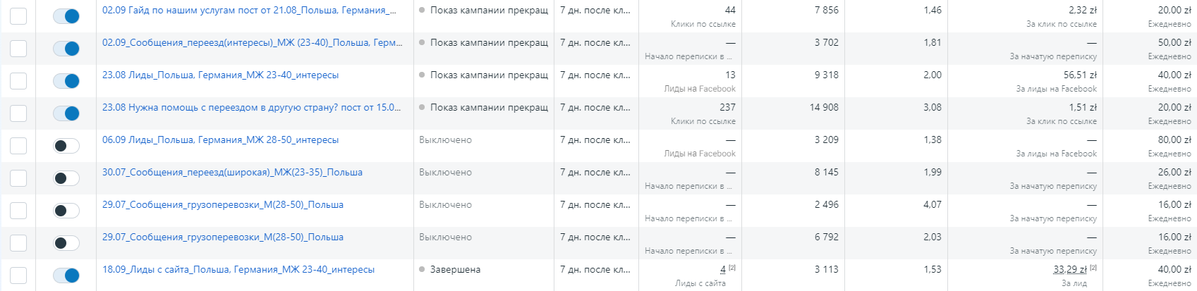 За время работы были протестированы следующие цели рекламных кампаний: сообщения, лиды, заявки на сайт, трафик в профиль. Рекламные кампании настраивались на следующие аудитории: