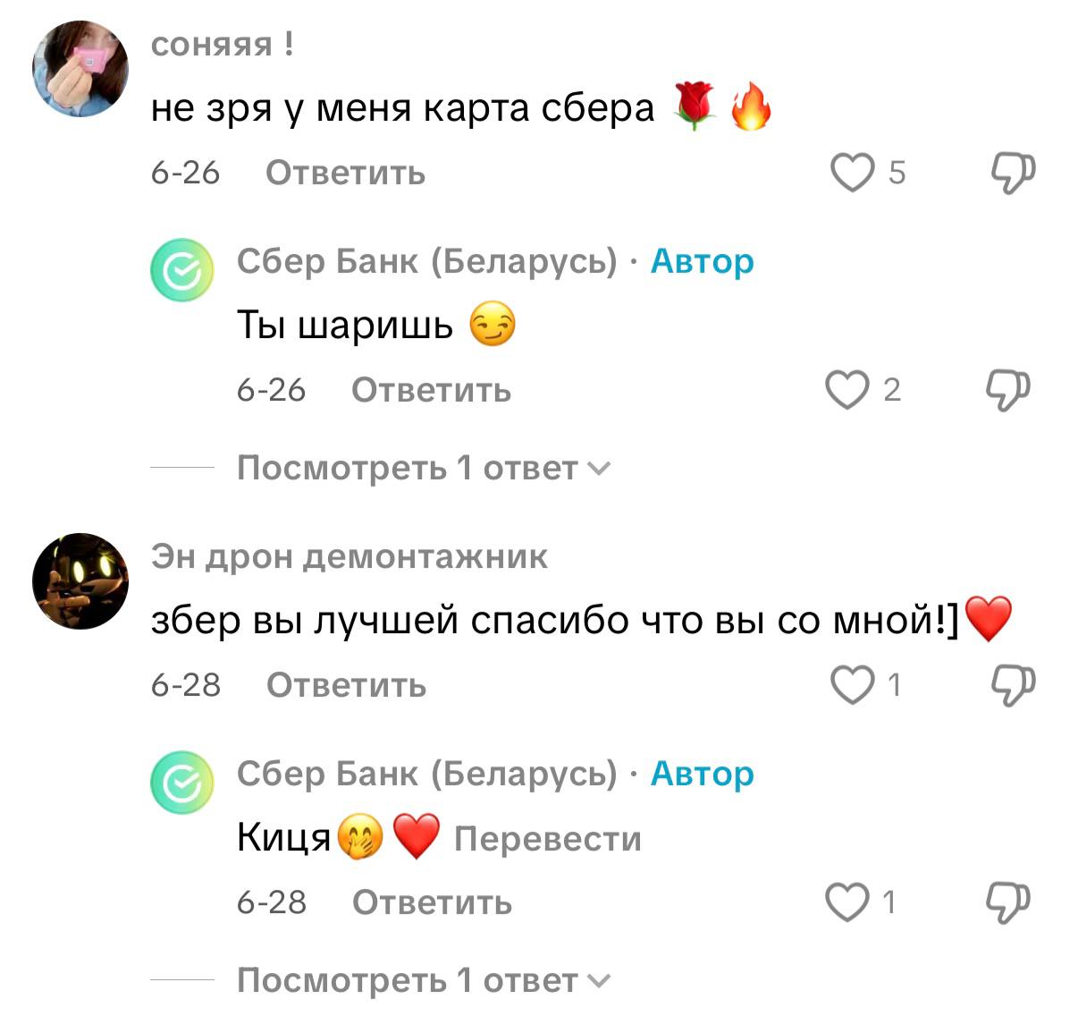 Комментарии, оставленные пользователями, подтверждают высокий уровень их вовлеченности. Использование молодежного и TikTok-сленга в коммуникации демонстрирует положительный отклик и подтверждает правильность выбранной стратегии по взаимодействию с целевой аудиторией